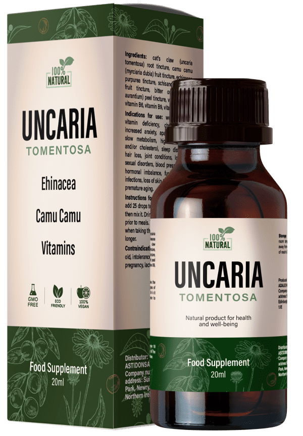 Uncaria es un concentrado vegetal. 25 gotas representan una porción, que contiene la cantidad necesaria de sustancias activas que aumentan la velocidad de quema de grasa en 3 veces. Clínicamente se ha demostrado que Uncaria acelera el metabolismo, restablece el funcionamiento del sistema endocrino, estimula la regeneración de tejidos y normaliza el apetito. El producto es completamente natural y actúa como un estimulante activo de los procesos naturales en el organismo humano. Dado que la quema de grasa se produce mediante la normalización del metabolismo, no se requiere una dieta estricta. Para mantener un metabolismo adecuado, es suficiente una dieta equilibrada junto con 25 gotas de Uncaria, tomadas dos veces al día.